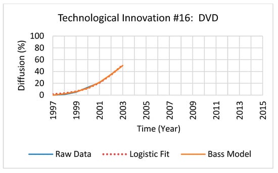 Each technological innovation maximum diffusion rate was solved by applying the model’s second derivatives root point to the model’s first derivative. The logistic and Bass models’ resultant maximum diffusion rates for each technological innovation examined are provided in Table 5 for reference. Additionally, the percent difference of the maximum diffusion rates between models (defined as the absolute value of the change in maximum diffusion rates, divided by the average of the two maximum diffusion rates, all multiplied by 100) of each technological innovation is shown in Table 5. As an illustration of the process of fitting each model to the diffusion steps, the raw diffusion data and fitted Bass and logistic models of a technological innovation at full maturation and at 50% of its lifecycle are shown in Figure 2 and Figure 3 for reference.