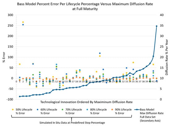 The principal goal of this research was to explore, at a macro-level, the development of general evaluation guidelines for diffusion rate assessment. This research explores assessed diffusion rates using historical matured technological innovation diffusion data through an EDA approach to identify such directional and associative patterns and trends. Building and developing such guidelines will aid resource decision makers as they consider proactive decisions and strategies to assess a technological innovation’s diffusion rate, a key factor identified for abandonment optimization of a technological innovation []. The following sections discuss the trends and patterns of the results and provide discussions of their implications framed against the driving question of this effort. The findings presented are an initial step toward understanding the underlying percent-error ranges and bounds associated with assessing a technological innovation diffusion rate over its lifecycle. To shape the discussion and interpretation of the results of this EDA effort, led by the research question put forth, let us begin by examining the trends revealed through the resultant graphical percent-error data.