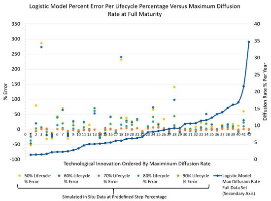 Logistic model percent-error at each lifecycle percentage bound (defined in Section 3.2), shown in relation to maximum diffusion rate at full maturation for each technological innovation.