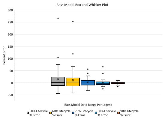 The resultant percent-error at each lifecycle percentage step, graphically illustrated in Figure 4 and Figure 5, shows a trend that as diffusion rate increases, the percent-error biases positive. In addition, another noticeable trend is that the percent-error outlier extremes also appear to be biased positive. This outlier bias is also recognized in the inclusive quartile box plots, shown in Figure 6 and Figure 7. These box plots also indicate that the percent-error outliers are more extreme when a technological innovation’s diffusion rate is assessed at 50 and 60% of its lifecycle. These revealed trends indicate that a decision maker is more likely to over-assess a technological innovation’s diffusion rate than under-assess. In addition, the box plots also reveal that diffusion rate percent-error outliers occur (in the worst case) in 3 out of the 42 diffusion rate assessments made (less than 8%) for each lifecycle percentage step explored. These data indicate that outlier occurrences, in general, are relatively low.