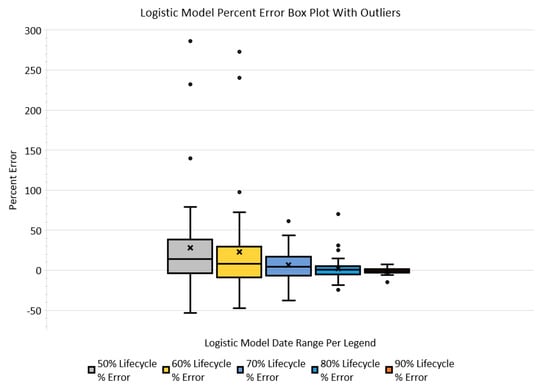 Logistic model percent-error statistical characteristic per lifecycle percentage used.