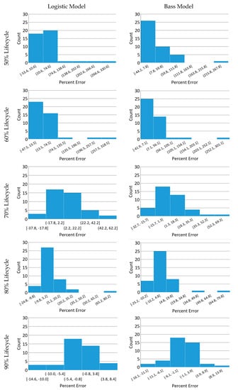 Histograms of the logistic and Bass model’s percent-error at each percentage step.