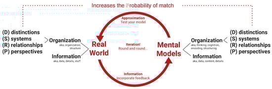 DSRP Theory articulates the universal structures and dynamics for organizing () information (). Both in the mind, as part of mental models ()—defined as the complex product of information and DSRP thinking (=⊗)—but also as part of reality ()—defined as the complex product of information and DSRP organization ()—where both and , and the hat symbol () is used to denote the sample or sampling of information and structure, as shown in Equation (1). It should be noted that different symbols are sometimes used for organization () to differentiate thought-based organization (where is used for “thinking”) versus more general organization (where is used) of information as is the case for energy and matter (that information is a basic property of the universe is well trodden [158,159,160,161,162,163]. Thus, . Thus, the goal of systems thinking is to increase the value of the fraction between our mental models and reality such that . The relationship between mental models and reality is a fraction because our mental models—quite literally—represent only a fraction of what exists. Incidentally, need not be bounded by 1 other than that the number 1 represents unity as in . It could therefore equal any number over itself. This is an aspirational goal. However, interestingly, it is this aspirational goal that differentiates the phenomenon of systems thinking from plain-old thinking. Because systems thinking has an expressed aspirational goal of making the fraction between mental models () and reality () equal to 1, such that . Thinking does not have this aspirational goal, so it does not require metacognition (just cognition). Otherwise, they are exactly the same. However that is a pretty big otherwise. The formalism for DSRP is detailed and explained in Equation (1):