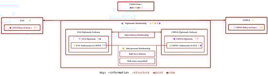 Table 2 provides the basic logic of DSRP explained in visual form. It may seem more abstract or esoteric than it really is. However, what is being described aids in the invention of basic systems mapping software like Plectica or network analysis where a single information variable acts as several different structures simultaneously. In Figure 2, for example, you can see that the node labeled US Ambassador to China is an identity, with a specific, articulated point of view on several items in the map (all the blue dots), and, a part of several larger wholes including being one part of a diplomatic relationship between the US and China. Simultaneously, the US Ambassador is engaged in an interpersonal relationship with the Chinese Ambassador which is, in turn, part of a larger system of relationships. All of the various nodes in this system (even the inanimate ones) may have a perspective on some Global Issue X.
