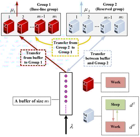 Switching between work and sleep: To save energy, the servers in Group 2 can switch between the work and sleep states. On the one hand, if there are more jobs waiting in the buffer, then Group 2 sets up and turns on some sleeping servers. This process usually involves a setup cost However, the setup time is very short as it directly begins from the sleep state and it can be ignored. On the other hand, if the number of jobs in Group 2 is smaller, then the working servers are switched to the sleep state, while the incomplete-service jobs are transferred to the buffer and served as the arriving ones.