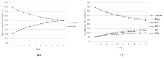 Market shares of different types of vehicles in baseline scenario: (a) comparison of market share of ICEVs and EVs; (b) market share by individual vehicle type.