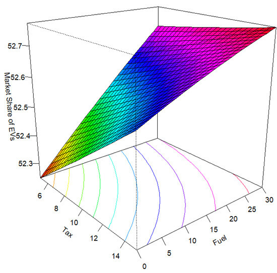 As observed in Table 3 and Figure 3 and Figure 4, the factor of purchase subsidies for EVs has the largest contribution to explaining the market diffusion of all types of EVs except for FCEVs. It can be confirmed that one of the main barriers to the transition to EVs is their higher purchase price relative to ICEVs, which has already been identified in previous studies. Hence, the role of subsidies in reducing the purchase price of EVs and thereby promoting their market diffusion seems appealing [28,29]. However, purchase subsidies alone may not be sufficient to facilitate the market diffusion of EVs, and individual factors should therefore be considered along with other factors in order to account for possible interactions among factors. Focusing on the market share of EVs as a whole, fuel costs and purchase taxes on ICEVs have the second and third largest contributions, respectively; these represent exogenous variables that will encourage customers to buy EVs rather than conventional ICEVs. Technical measures, specifically improvements in battery charging time and driving mileage per full charge, are ranked fourth and fifth, respectively. Finally, there is not sufficient evidence regarding the significance of the contribution of improved charging station accessibility to promoting EV market diffusion, as this factor exhibited a negative value in the Boruta feature selection algorithm. The insignificance of charging station accessibility may be explained by the fact that the current level of charging station accessibility is low enough that even a 100% improvement might not be sufficient enough to affect the diffusion of EVs. Consequently, five of six factors (excluding charging station availability) were included in the subsequent analysis of the simulated data using full factorial and RSM.