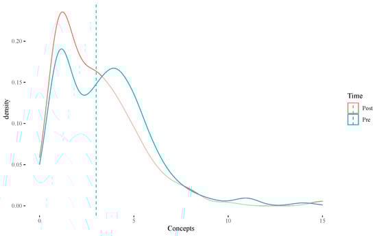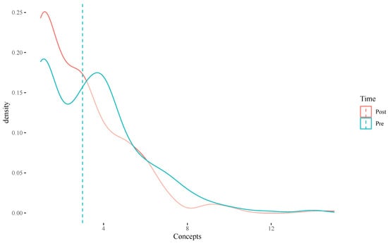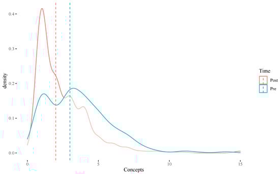Results in Table 12 and Table 13 show that the distribution of number of concepts (i.e., the number of individual entries the subject made, “raw data”) was not significantly different before and after treatment (p = 0.062 using Wilcoxon signed-rank test). Data (N = 383) were summarized using median (IQR). Statistical analysis was performed using Wilcoxon-signed rank test. However, the median number of words used after treatment (Mdn = 6, IQR 3–10) was significantly higher than the median number of words used before treatment (Mdn = 4, IQR 3–7, p < 0.001 ***). Similarly, the median number of characters used after treatment (M = 29, IQR 14–53) was significantly higher than the median number of characters used before treatment (Mdn = 12, IQR 13–36, p < 0.001 ***).