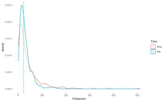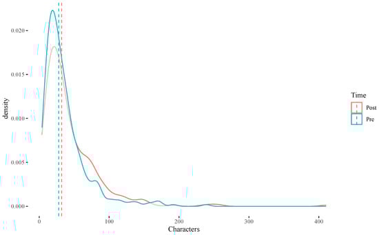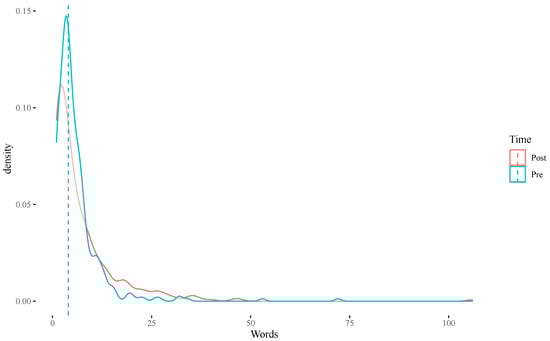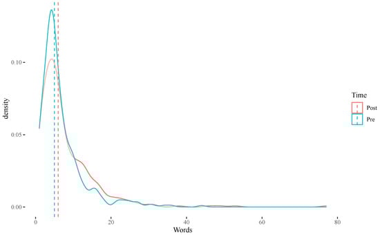 Results in Table 14 show that the expected average count was not significantly different before and after treatment (IRR = 1.05, p = 0.201). However, the expected number of words was higher by 43% post-treatment than before treatment (IRR = 1.43, p < 0.001 ***). Similarly, the expected average number of characters was higher by 41% post-treatment than pre-treatment (IRR = 1.41, p < 0.001 ***). Education and Age were not statistically significant factors in pre-post differences, indicating universality. Male gender was associated with lower expected number of words (IRR = 0.67, p < 0.001 ***) and characters (IRR = 0.69, p < 0.001 ***).