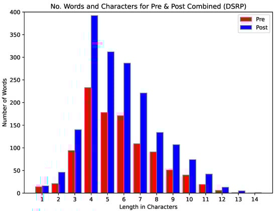 Distribution of words and characters (vertical lines represent median) for Distinctions (D).