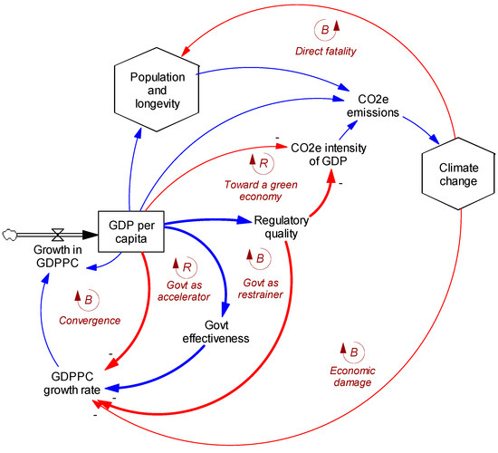 The statistical analysis above suggests formulation enhancements for two elements of the original climate-population model [13]—namely, the GDPPC growth rate and the CO2-equivalent emissions intensity of GDP. It also suggests how the new variables, Government Effectiveness and Regulatory Quality, might be formulated. These model changes may be seen diagrammatically in Figure 1, which gives an overview of the entire revised model (implemented using Vensim™ Professional x64 version 8.2.1).
