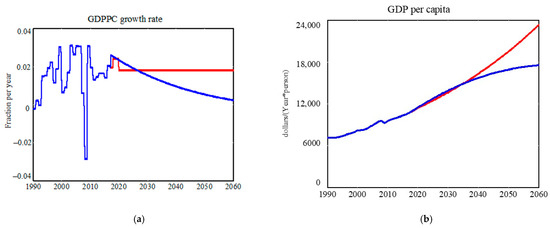 • Equation (1) (GDPPC growth rate): Coefficients for ln(GDDPC), GE, and RQ were adjusted (within ranges suggested by regression H1 in Table 3) to maintain a good fit to baseline projections for global GDPPC [20] through the 2020s and 2030s (Figure 2). The new base run produces a more realistic convergent glide path (blue line; compared with original model red line), with the growth rate declining to 0.2%/year by 2060, similar to that of higher-income countries today. Lower GDPPC in the revised model during 2040–2060 leads, in turn, to lower average life expectancy in 2060 (75.8 vs. 78.1 years). There is virtually no effect on the projection of total population (10.15 vs. 10.14 billion in 2060) because the lower life expectancy is fully offset by a higher birth rate due to lower GDPPC. (For more detail on the projected impacts of changes in GDPPC on life expectancy, birth rate, and total population, see [13]).