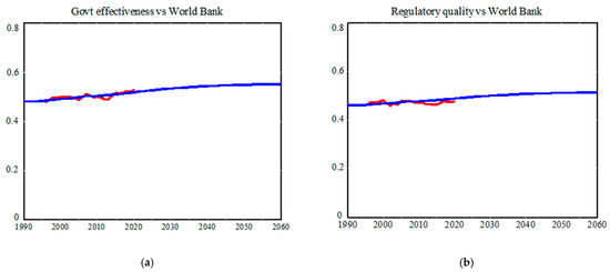 Figure 3. Base run output 1990–2060 (blue) and world average calculated from WGI data 1996–2020 (red) for (a) Government Effectiveness (0–1) and (b) Regulatory Quality (0–1).