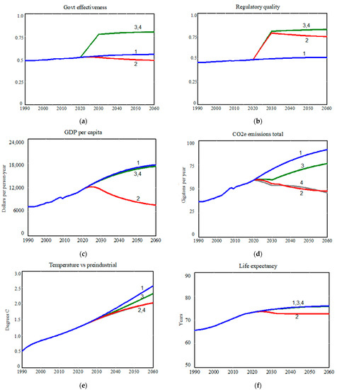 Figure 4. Layered policy testing results: 1-Blue: base run; 2-Red: boost Regulatory Quality 60% by 2030; 3-Green: also boost Government Effectiveness 45% by 2030; 4-Grey: also ramp emissions intensity of GDP down an additional 40% by 2060. For six output variables 1990–2060: (a) Government Effectiveness (0–1), (b) Regulatory Quality (0–1), (c) GDP per capita (2010 USD/person/year), (d) CO2e emissions (gigatons/year), (e) temperature delta (°C), (f) life expectancy (years).
