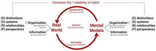 - Efficacy (applied research): focused on the questions: “Is DSRP effective? Does metacognition of DSRP increase effectiveness in navigating cognitive complexity in order to understand system (ontological) complexity?” This gets at the critically important issue of ‘parallelism’—defined as the probability that our cognitive organizational rules align with nature’s organizational rules—which is central to the idea of the systems thinking/DSRP loop [75]2 (Figure 7).