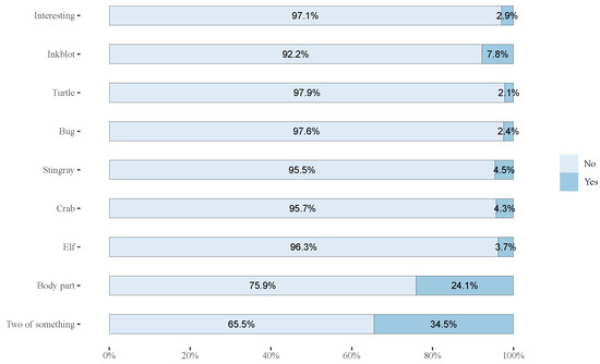 - 21.82% (43/197) named it ‘nothing’, ‘none’, or ‘blank’, and 3.04% (6/197) gave ‘other’ names that could not be interpreted, such as ‘desk’ or ‘unknown’.
