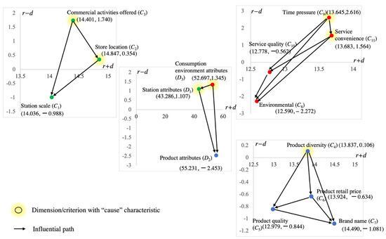 Table 3 provides the empirical results of DEMATEL and DANP, and INRM is given in Figure 3. The empirical results of the dimensions are indicated first. According to r + d, which represents the total influence degree, the order is as follows: product attributes (D2) (55.231), consumption environment attributes (D3) (52.697), and station attributes (D1) (43.286). The order of r − d, which represents the cause/effect characteristic, is as follows: consumption environment attributes (D3) (1.345), station attributes (D1) (1.107), and product attributes (D2) (−2.453). Consumption environment attributes (D3) and station attributes (D1) belong to the “cause” dimensions, meaning that they impact product attributes (D2). Consumption environment attributes (D3) also impact station attributes (D1). Product attributes (D2) with a negative value is the “effect” dimension.