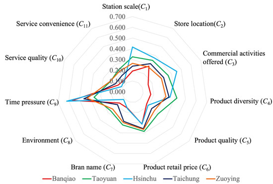 The DANP weight shows the regional and global weight. First, the regional weights of the three dimensions from high to low are: product attributes (D2) (0.381), consumption environment attributes (D3) (0.340), and station attributes (D1) (0.279). In terms of criteria, within the station attributes (D1), station scale (C1) (0.099) is the highest, followed by store location (C2) (0.096), and commercial activities offered (C3) (0.084); within the product attributes (D2) criteria, brand name (C7) (0.103) is the highest, followed by product retail price (C6) (0.096), product diversity (C4) (0.091) and product quality (C5) (0.091); within the consumption environment attributes (D3) criteria, environment (C8) (0.098) is the highest, followed by service quality (C10) (0.088), service convenience (C11) (0.080), and time pressure (C9) (0.073). The order of global weights is: station scale (C1) (0.356), store location (C2) (0.343), commercial activities offered (C3) (0.301), environment (C8) (0.289), brand name (C7) (0.270), service quality (C10) (0.260), product retail price (C6) (0.253), product quality (C5) (0.240), product diversity (C4) (0.238), service convenience (C11) (0.236), and time pressure (C9) (0.215).