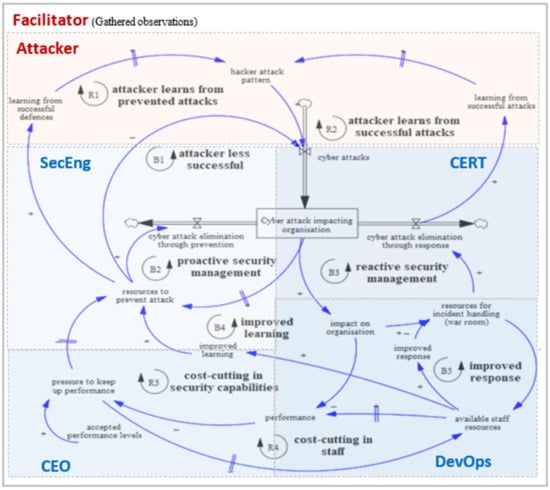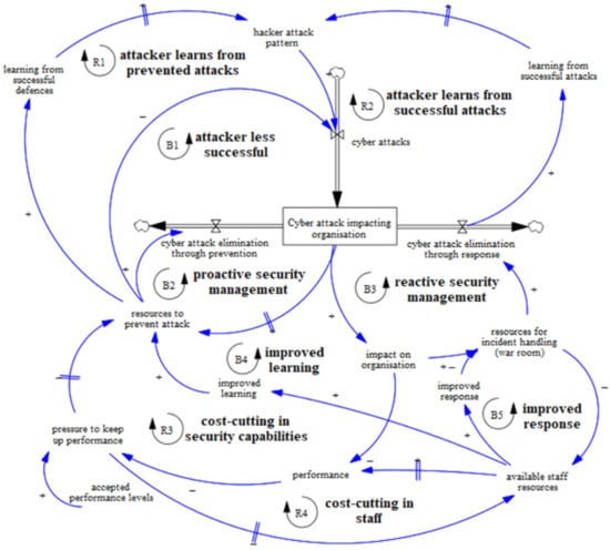Limited access for researchers to boardrooms and the unpredictability of cyber-attacks makes it hard to consistently observe decision-making concerning cyber-security over extended periods in organisations and companies. Nevertheless, managerial and financial cyber-security decisions play a crucial role in modern companies, as they can have significant organisational and economic impacts [1,2]. This is evident in several recent real-life cyber-security incidents, e.g., WannaCry [3], Carbanak [4], and Diginotar-hack [5], where inadequate resource allocation led to security breaches. Such incidents may then affect companies’ competition [6] and market value [7]. Decisions on cyber-security are not only relevant to the security system but also to the overall behaviour of the organisation. However, making decisions in such contexts is difficult, as they confront decision-makers with a complex and dynamic system [8]. Specifically, the underlying systemic conditions constantly change over time and are driven by intricate and delayed interdependencies among the various areas of the company, due to the presence of feedback loops [8,9,10]. The literature reports various explanations for poor managerial decisions in cyber-security. These range from the misalignment of interests between different internal [11] and external [12] stakeholders to economic arguments (striking for a balance between over- and underinvestments [13]) and willingness to pay [14]; from social and behavioural ones (e.g., ‘cover-my-ass-security’ strategy, when a lot of resources are spent on a security issue by managing defenders to show to have done their best and protect themselves from future criticism [15]) to just psychological ones, such as fear, uncertainty and doubt [16]. Overall, these reasons can be traced back to the challenges of understanding and managing complex systems [17,18,19,20].