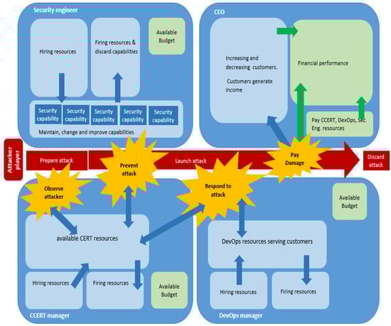 At the same time, serious games are increasingly being used in the field of cyber-security, both as training tools and as instruments to encourage security behavioural change [22,23,24]. At the core of many of such “gaming simulations”, there is the interaction between attacker and defender [24,25], mainly focusing on the IT technical side, namely on infrastructure (e.g., network security), defensive procedures and staff awareness (e.g., phishing countermeasures). Surprisingly, cyber-security management decisions and related financial consequences in a business context are often not fully considered (or even completely disregarded) in such games [22].