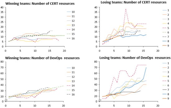 Secondly, resource allocation was measured by the number of staff allocated to the CERT and DevOps departments. We focused only on these resources because they showed the most distinctive behaviour over time. They were plotted for each round, thus allowing us to compare time series for winning and losing teams (Figure 4). From the figure, it is possible to note how the two groups differed in staffing policies: winning-teams displayed a more stable staffing policy, whereas losing teams showed an unstable one, characterised by sudden increases and reductions in the staff volumes. On average, the losing teams had approximately twice as many human resources compared to the winning teams.