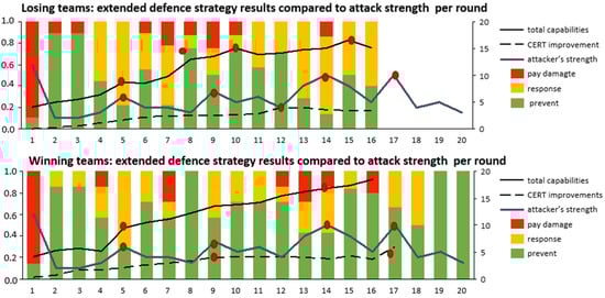 Thirdly, we investigated the adopted cyber-security strategies for both the winning and losing teams. This was a comparative analysis of the defenders’ reactions to attacks in relation to capability maturity and the attacks’ strength. To do so, we separated the defender actions into the following categories: ‘prevent’ (resources are allocated to increase attack prevention), ‘response’ (resources are assigned for resolving an incident that has occurred) and ‘pay damage’ (the CEO has to pay for the damage caused by the attack). We grouped the winning and losing teams, averaged the total strength of the attacks incurred by the teams per round and plotted the obtained results of attack strength over time against defender actions. The strength of the attack launched by the attacker in each round was the same for all the teams. This is visible in the attacker strength curve. The results are shown in Figure 5, where the total combined results of the defender (combination of prevent, response and pay damage) and the attack strength curves are reported on a relative scale of 0.0 to 1.0 (left axis—1.0 corresponds with 100% of the launched attacks). According to the Mann–Whitney U test, there was a significant difference (z = −2.652 and p = 0.00402) between losing (prevented 50% of all attacks launched during the played rounds) and winning teams (prevented 63% all attacks launched during the played rounds): the latter prevented significantly more attacks (about 13 percentage points).