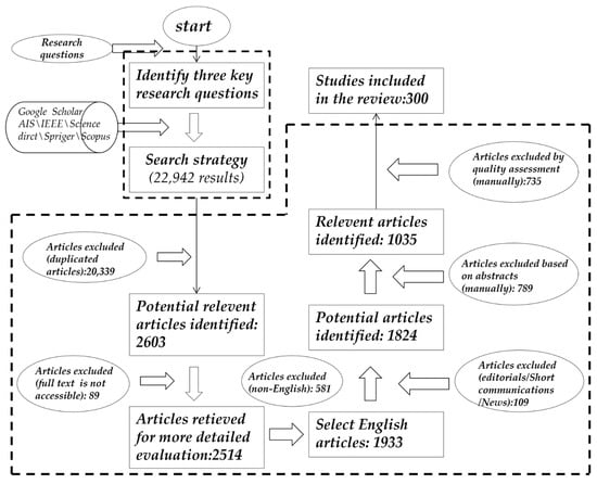 Each article receives a score from −4 to 4 in this quality assessment. Every study receives a label based on the total score: −4–0 for low quality, 0–2 for medium quality and 2–4 for high quality. Articles filtered by the low-quality label are excluded (735 articles), and 300 articles remain to answer the research questions (86 studies with the high-quality label and 214 studies with the medium-quality label).