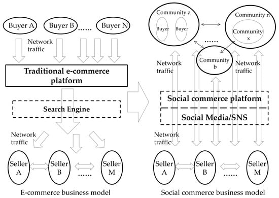 The concept of social commerce mainly has two sources. First, social commerce is based on e-commerce. Without e-commerce, social commerce can only be a concept, which cannot be applied in commercial activities []. It is believed that e-commerce provides the fundamental ICT foundation of social commerce [,,]. Secondly, social shopping is the other critical source of social commerce. Social shopping is the prototype of social commerce before social networking based on the Internet became available [,,]. Some studies also conclude that the two sources of social commerce are online shopping and social networking, which is in line with our understanding [].