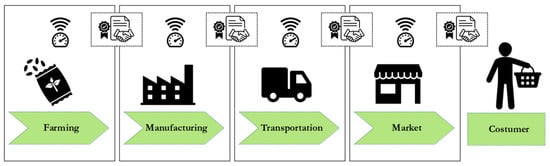 Let us consider extra virgin olive oil [] as an agri-food product for more details of the traceability system. At the farming stage, IoT devices can monitor several parameters that might affect the quality of the olives, including air pollution, temperature, humidity, and soil conditions. These measures can be as granular as each tree on the farm. However, the event-based traceability will store only the totals (i.e., the monthly average for all trees on a sector) for a given batch. Similarly, IoT sensors can provide detailed information about production processing at the manufacturing stage but store only the totals for a single oil bottle in the blockchain. Later on, IoT sensors can provide tracking information during the transportation stage, including accurate GPS positions and environmental conditions such as temperature, humidity, and light exposure. In this case, blockchain stores only transportation anomalies that might void the delivery contract (e.g., a temperature beyond a certain threshold). Next, IoT monitors can monitor environmental parameters at the retailer storage during the market stage, while the system only records irregularities occurring before the product arrives at the final consumer. Finally, the consumer can effortlessly retrieve the entire history of the bottle of olive oil using blockchain transactions that guarantee the integrity and transparency of the data collected across the entire process.