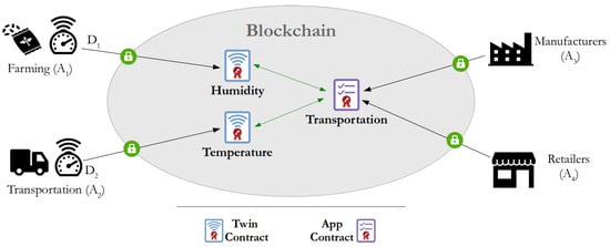 We conceptualized the architecture for the traceability systems as a layered software comprising three modules: device, gateway, and blockchain, as shown in Figure 3. First, the device module converts the sensed values into blockchain transactions for the corresponding smart contract. Then, the gateway module acts as a simple and transparent relay component between the device and the blockchain modules, providing the required network connectivity. Finally, the blockchain module includes two types of smart contracts: twin contract and app contract. The twin contract represents the IoT devices, and the app contract implements a different process of the traceability system, such as the transfer of ownership between stakeholders. Accordingly, app contracts can directly interact with twin contracts, considering them trustworthy oracles for the blockchain system. In the following paragraphs, we briefly describe each module and provide the implementation details.