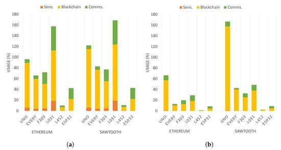 Using the statistics provided by the compilers, we estimated the footprint of each component of the device module. The results, in terms of disk usage (program space), are shown using Table 4a (absolute values) and Figure 4a (normalized to the total available). The same approach was taken for memory usage, using Table 4b and Figure 4b. Sensing (Sens) and communications (Comms) components are the same for both implementations. The footprint of the blockchain integration component for Ethereum is represented by Eth, and the blockchain integration component for Sawtooth is represented by Saw. Our results show that an 8-bit board with 32 kb of disk space can fit the Ethereum implementation; however, the same amount of disk space is not enough on the 32-bit boards. Results also show higher requirements for the Sawtooth implementation, which allows only four boards to run the entire device module for this platform.