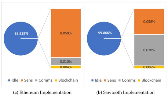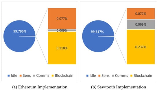 The Sawtooth protocol’s overhead also impacts constrained devices regarding the energy budget. For example, in one hour of work, measuring every 5 min, in the board with the higher power requirements, blockchain operations for Sawtooth accounted for 0.24% of the total energy budget, while Ethereum accounted only for 0.12%. However, in the context of the entire energy budget, the requirements of both implementations are minimal, as the idle state accounts for more than 99% of the total requirement.