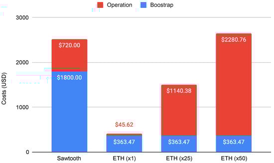 Infrastructure costs (bootstrap and operation phases) for the traceability application on Sawtooth and Ethereum implementations.