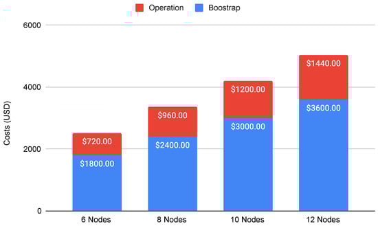 Infrastructure costs (bootstrap and operation phases) for the traceability application on Sawtooth considering different number of nodes.