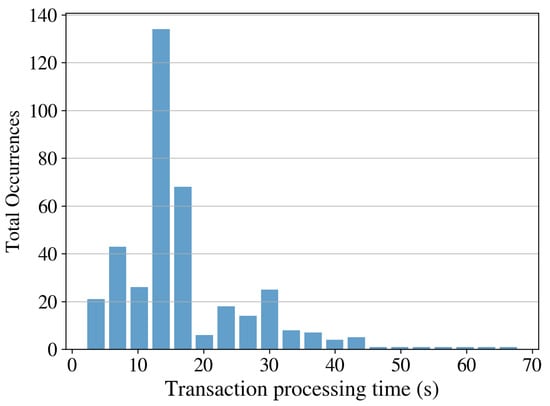 We evaluated the transaction processing time for executing the setValue() operation as it is the most frequent transaction in the system. To avoid the monetary cost of using the Live Ethereum network, we use the Ropsten test network. This network uses the same proof-of-work consensus algorithm and provides similar time response to the live Ethereum network, but without the associated monetary cost. We sent one transaction approximately each 30 min over a period of one week, for a total of 336 transactions, using the gas price of 60 Gwei. Figure 9 shows the distribution of the processing times for the transactions. The average processing time was 17 s, which is within the current limit of the network. Furthermore, just a couple of transactions took more than one minute to process. As a reference, in the private Sawtooth network, the average processing time for the transaction was less than 1 s.