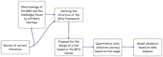 The goal of this research work is to present a process-driven, easy-to-use approach to business model development and innovation with a focus on key success factors (as defined by the triple cornerstone framework), one that overcomes the shortcomings of previous lean-based business modeling frameworks. The research methodology can be outlined as shown in Figure 2. Many lean-based business development frameworks have been proposed, such as the lean startup framework by Ries [15] and the BMC by Osterwalder and Pigneur [16], to guide startups in their business model development journey. As part of this work, the existing literature was reviewed to uncover the challenges faced when using these lean-based frameworks, with the aim of business model development and innovation for software startups. Some of the challenges include the lack of certain elements, such as a strategic foundation for startups, the establishment of a unique selling proposition (USP), taking into account competing entities as part of the business model development and innovation process, the consideration of synergies of the various segments of the business model and the benefits of identifying and using metrics as part of business model development. The reviewed literature is also used to design a new framework for business model development and innovation, with the aim of overcoming the shortcomings of existing frameworks. The proposed framework takes into account key success factors (identified as a part of the triple-cornerstone framework) to ensure that the focus of the framework is directed toward ensuring the success of the software startup. To test out the validity of the framework, a software application or tool is designed and prototyped with the aim of gathering feedback from users. The feedback is collected in the form of end-user surveys and the model is assessed using the (quantitative) data collected as the outcome of these surveys.