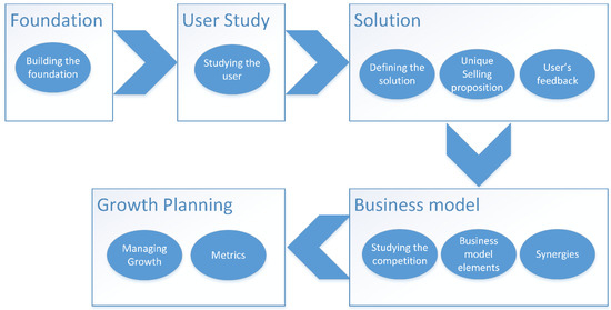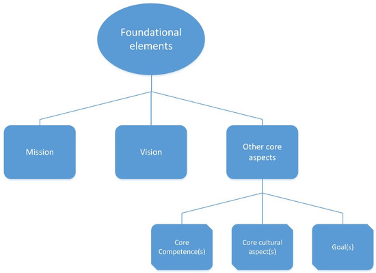 The foundation layer also describes the core culture of the startup, which outlines how tasks are accomplished, with an emphasis on best practices. This is because of how the startup functions; the nature and quality of the outcome and its general evolution are impacted by the organizational culture, which is determined and established during the initial phases of the startup [44]. Lastly, the core competencies of the startup team are also noted during this phase, since identifying these can be vital for the startup’s success [45,46]. This would involve listing what skills are needed to accomplish key goals (along with the overall vision) and outlining which skills the startup currently has. Core competence can be a good indicator of which tasks the organization can perform in-house and which tasks the organization can consider outsourcing [47]. As an instance of this, Apple has claimed that its core competence of good design has provided it with a competitive advantage [48]. The identification of core competencies can translate into becoming a sustainable competitive advantage for organizations [49], and certain competencies could be particularly relevant during the early stages of the startup’s journey [50]. Establishing these details before delving into the business model can provide much-needed direction for the business in times of uncertainty (such as market turbulence) and help guide the development of future products. As part of this stage, these details are discussed and noted. The elements of this stage are presented in Figure 4.