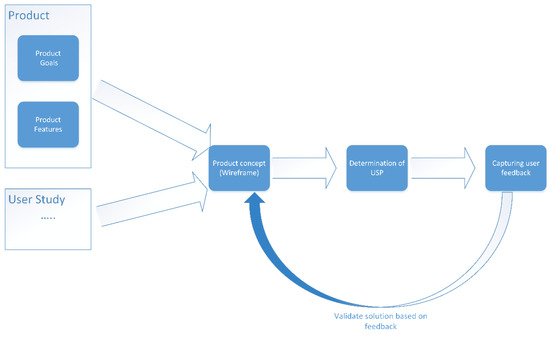 The product goals are then defined for the solution concept, based on the study of the user. As outlined by Betta et al. [56], a successful outcome for product development undertakings becomes more likely when the goals are defined clearly. The defining of goals is also outlined as a best practice in the product development literature [57,58]. The primary purpose is to ensure that the goals of the product are in line with the mission, vision and goals of the organization, as suggested by Barczak and Kahn [57]. Alongside the product goals, product features are determined. The user stories from the previous stage can serve as good indicators for identifying the desired features. This is because at least one feature is captured as a part of every user story [59]. User stories, owing to their simplistic format of requirements capture, have sometimes been accused of lacking contextual clarity [60]. To overcome this, a description of the product feature can be captured alongside the feature itself. The defined features are also prioritized using MoSCoW analysis, which is a commonly adopted technique in the agile school of methodologies [61,62]. As part of this prioritization technique, the feature sets are classified based on “Must-have”, “Should-have”, “Could-have” and “Won’t-have” features. The prioritization and decision-making process to determine which features need to be included when working with an iterative development methodology is known to be a challenging task [63]. Handling this as part of this stage could allow the development team to prioritize the features optimally for the development process.