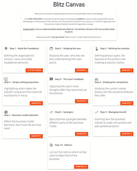 This research reviews the usefulness and effectiveness of the proposed BC framework through the use of an online survey instrument. For the purpose of evaluation of the model’s effectiveness, a web-based tool named iVenture (link to the iVenture app prototype used for the purpose of concept validation survey: https://iventure-v1.web.app/Bcprocessmodel, accessed on 1 February 2022) was created to take the participants through the ten stages and then present the business model in the form of a dashboard. A survey was conducted based on the interactions with this tool. To reduce the cognitive load of the participants, a business model was created around a fictional to-do list product called “MyToDo”, which is aimed at helping users to improve their productivity by improving their task-management skills. The participants are taken through the process of business model development using the tool and are then requested to answer the questions put forward in the survey. Essentially, the tool presents the users with a pre-built business model for them to interact with and lets the users get a feel for the process of business model development and innovation, using the framework step-by-step through its various stages. Figure 10 shows an overview of the process that the framework uses to develop the business model. From this screen, the participants will need to traverse through the various stages, guided by an application interface, upon completion of which process they will be presented with the business dashboard. Figure 11 shows the developed business model, presented in the form of a dashboard.