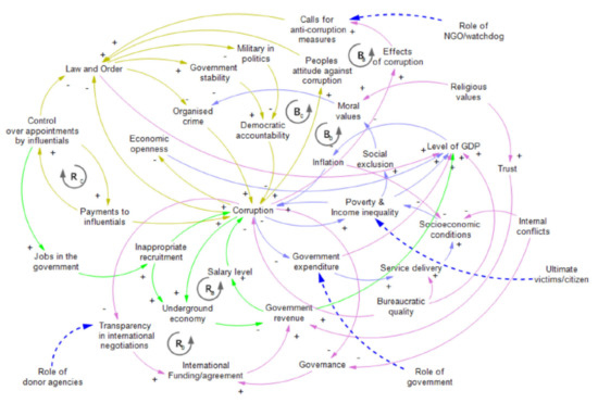 System Dynamics and Systems Thinking go hand-in-hand [16,17,80]. Systems Thinking provides a holistic view of the interactions contributing to an outcome expressed as a Causal Loop Diagram (CLD). The CLD developed using Systems Thinking shows the full complexity of the problem at hand, and then simplifications are necessary to create a working quantitative System Dynamics simulation. Figure 1 was developed in [76] based on 43 in-depth interviews and 155 survey interviews with government officials, aid agencies, civil society organizations, business people, lawyers, and the general public in Pakistan. It shows the complete set of relationships considered to represent the problem of corruption in a nation. In the CLD, connections with directed arrows imply that a change in the tail variable leads to a change in the variable at the head of the arrow. An arrow labelled with polarity ‘+’ means changes in the same direction. Increasing the tail variable increases the head variable, and decreasing the tail variable decreases the head variable.