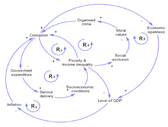 Figure 2 is a simplification of the part of Figure 1 that focuses on economic factors related to corruption. Because the literature review indicated the difficulty distinguishing the causes from the consequences of corruption, this model uses the interviews and surveys conducted by Ullah et al. [76]. Figure 2 shows how five reinforcing loops can explain how corruption impacts various economic factors in a country and how these economic factors, in turn, impact corruption. First, examining the reinforcing loop, , we suggest that inflation increases the cost of living in a country, causing its citizens to turn to illicit means to augment their income. The loop, , suggests that increasing levels of misbehaviour by public servants could negatively impact the effective use of government expenditure. This could result in less money devoted to social services, which will negatively impact the citizens’ socioeconomic conditions, increasing the levels of poverty and inequality, resulting in higher levels of corruption in the nation as a whole. Loop suggests a close synergistic relationship between poverty, income inequality, and corruption. Loop brings organised crime into the model in a way that results from moral values. Finally, loop suggests that although higher levels of imports and exports can support growth in GDP, it may also result in higher levels of inflation which encourages higher levels of corruption as described above. As such, the five loops reinforce each other on how economic factors in a country impact corruption.