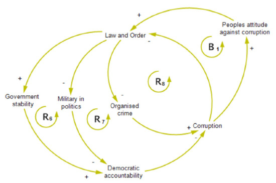 Figure 3 is a simplification of the part of the CLD in Figure 1 that focuses on governance factors related to corruption which is similarly based on the literature review and the qualitative research by Ullah et al. [76]. Loop suggests that increasing levels of corruption can result in perceptions of lower levels of law and order, which could lead to lower government stability and political accountability, leading to more corruption. Loop brings into the model the impact of the military in politics, how it is affected by reductions in law and order, and its adverse effect on democratic accountability, resulting in increasing levels of corruption. Loop shows the close relationship between corruption’s negative impact on law and order and how reduced law and order increases the potential for higher levels of organised crime leading back to higher levels of corruption. Finally, there is a balancing loop, , where citizens may not tolerate high levels of corruption and demand higher levels of law and order, government stability, and democratic accountability, and lower levels of the military in politics and organised crime.