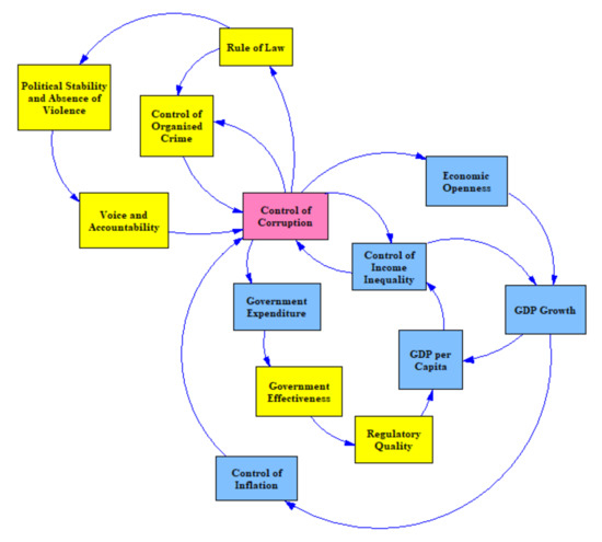 Mauro [24], supported by Rose-Ackerman [34], Treisman [35] and Myint [36], states that institutional “weaknesses are intrinsically linked.” Furthermore, Mauro suggests that “getting rid of corruption helps a country overcome other institutional weaknesses, just as reducing other institutional weaknesses helps to curb corruption” [24]. However, with no clear way to distinguish the causes from the consequences of corruption, our assumptions must be made explicit in the modelling because System Dynamics is based on cause and effect relationships.