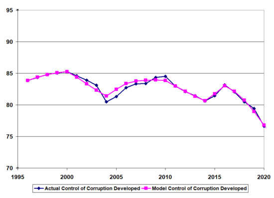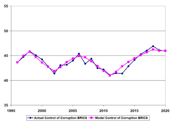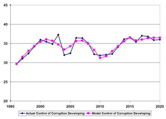 Figure 6, Figure 7 and Figure 8 provide the time-series data for the control of corruption (actual) and the model results for control of corruption (model) after calibration for the developing country (Pakistan), the BRICS country (India), and the developed country (Canada).