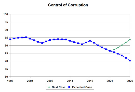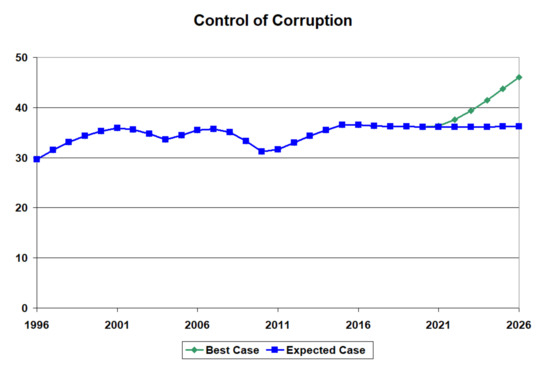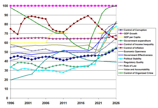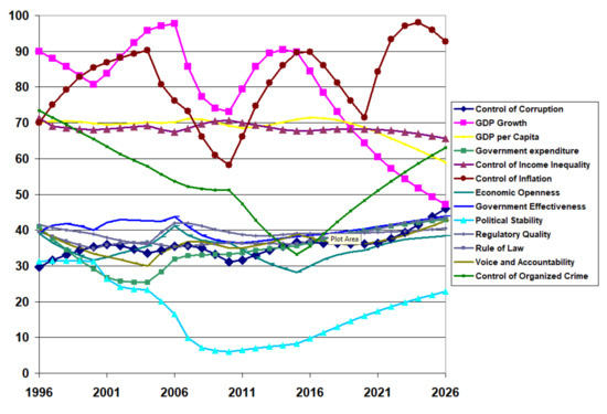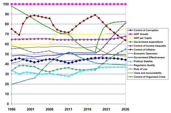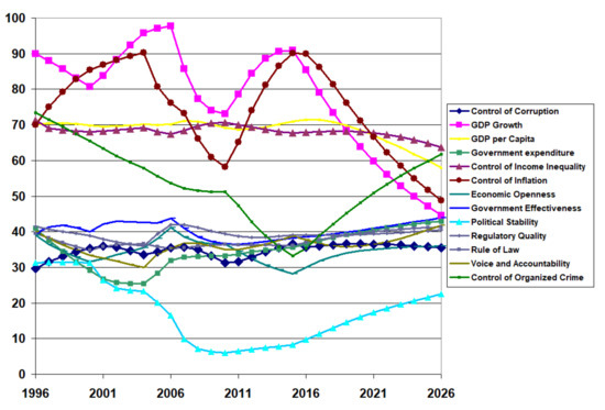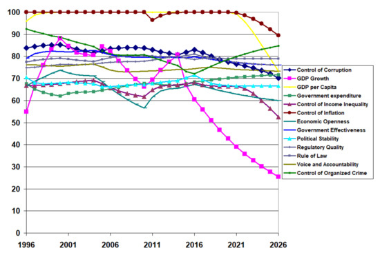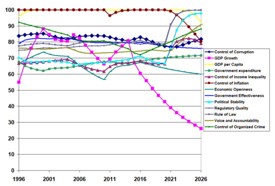 The Table 2, Table 3 and Table 4 fail to show the variability in the institutional quality, especially in the economic indices. Figure 9 shows the transient behaviour of the calibrated results for the 13 institutions in an example developing country (Pakistan) between 1996 and 2020 and the projected values to 2026 if there are no policy changes in 2021. GDP growth and inflation control suffered a drastic decline starting around 2014, with a decline to continue into the near future. To a lesser degree, GDP per capita and control of income inequality trended downwards in the recent data, projecting further decline. Interestingly, political stability, the absence of violence, and the control of organised crime trended downward in the early years. However, as the trend reversed, it foresees a continuous upward trend but at a slower rate. Of particular interest in this study is the projection of the control of corruption to decline slightly in the future.
