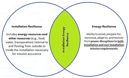 Government policy reflects the demand for increased energy resilience. The United States Code (USC) incorporates the concept of energy resilience and defines energy resilience for the DoD as “the ability to avoid, prepare for, minimize, adapt to, and recover from anticipated and unanticipated energy disruptions in order to ensure energy availability and reliability sufficient to provide for mission assurance and readiness, including mission essential operations related to readiness, and to execute or rapidly reestablish mission essential requirements” []. This definition is inclusive of DoD energy needs both on and off DoD installations.