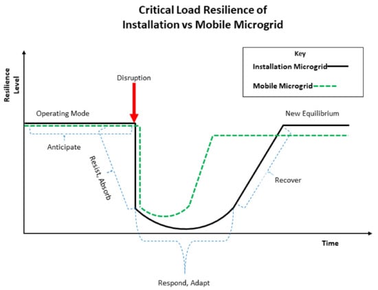 This is a standard resilience curve that shows an un-scaled comparison between the installation microgrid recovery and mobile microgrid recovery for a single critical load. The anticipated result is that the mobile microgrid will provide a shortened “Respond, Adapt” and “Recover” time than an installation microgrid following a disruption. Adapted from [,,,]. This figure assumes that the installation microgrid has failed and a mobile microgrid is requested immediately following the disruption event. Unlike the installation microgrid, which will require troubleshooting and potentially repair, the mobile microgrid is stored in an operable state, with all components stored, functional, and awaiting deployment. For the mobile microgrid, the “Respond, Adapt” phase becomes the collocation and hookup of the system. The “Recover” phase has a steeper slope for the mobile microgrid because the system did not fail, but instead serves as a backup power system, whereas the installation microgrid is assumed to require restoration activities in the “Recover” phase following a major disruption.