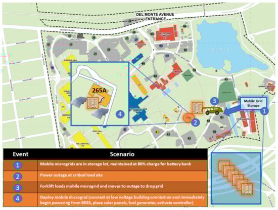 For the Department of Defense (DoD), mobile microgrids provide a solution to support DoD energy resilience goals following a power outage. The DoD increasingly relies on continuous, uninterrupted electrical power to successfully execute its many missions [,]. This drives the DoD to increase standards for energy resilience. Energy resilience is the ability to prevent power disruptions, and in the event of a power outage, restore electricity as quickly as possible to minimize the consequences of the outage []. For DoD installations, the consequences of a long-term power outage may equate to a failure of mission critical functions such as current communications with deployed forces or command and control of deployed assets []. Not all power outages effect mission critical functions, but when they do, it can impact national security.