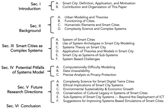 Organization of paper: The organization of the paper is as follows. Section 2 presents a background from urban modeling, theories, and functioning of cities to smart cities and complex systems. Section 3 discusses smart cities as complex systems. Its subsections elaborate on the system of smart cities, use of system archetypes in smart city modeling, system theories, and application of theories and models in smart cities, along with system-based challenges. Section 4 elaborates on the potential pitfalls of modeling a smart city as a SoS. Section 5 presents future research directions and further elucidates the analytical discussion on the way forward. Finally, the paper is concluded in Section 6. The organization of this paper is illustrated in Figure 1.