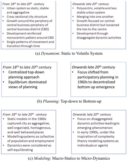 Alonso, in 1964, was the first to formally construct an urban economic theory, known as the new urban economics. Isard et al. presented a practical method catalog based on ideas of spatial interaction inspired by macroeconomic models such as input–output analysis and social physics [8]. During the 1970s and 1980s, the aggregate static procedure to theorizing and modeling motivated the switch to disaggregate activities in which planning focused on bottom-up decentralized urban dynamics that deal with intrinsic processes of change such as chaos and bifurcation theory, examining rapid and chaotic cycles in urban phenomena. In the late 19th century, the agent-based approach shifted the focus to very micro-level agents [29]. Later, these ideas to incorporate emergent patterns inspired models to analyze systems within the system. Figure 2 shows the main features of cities, planning, and urban modeling, as highlighted in literature from the 18th to the late 20th century. In what follows, some of the main urban models are discussed.